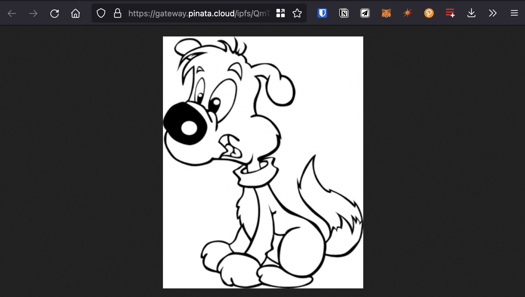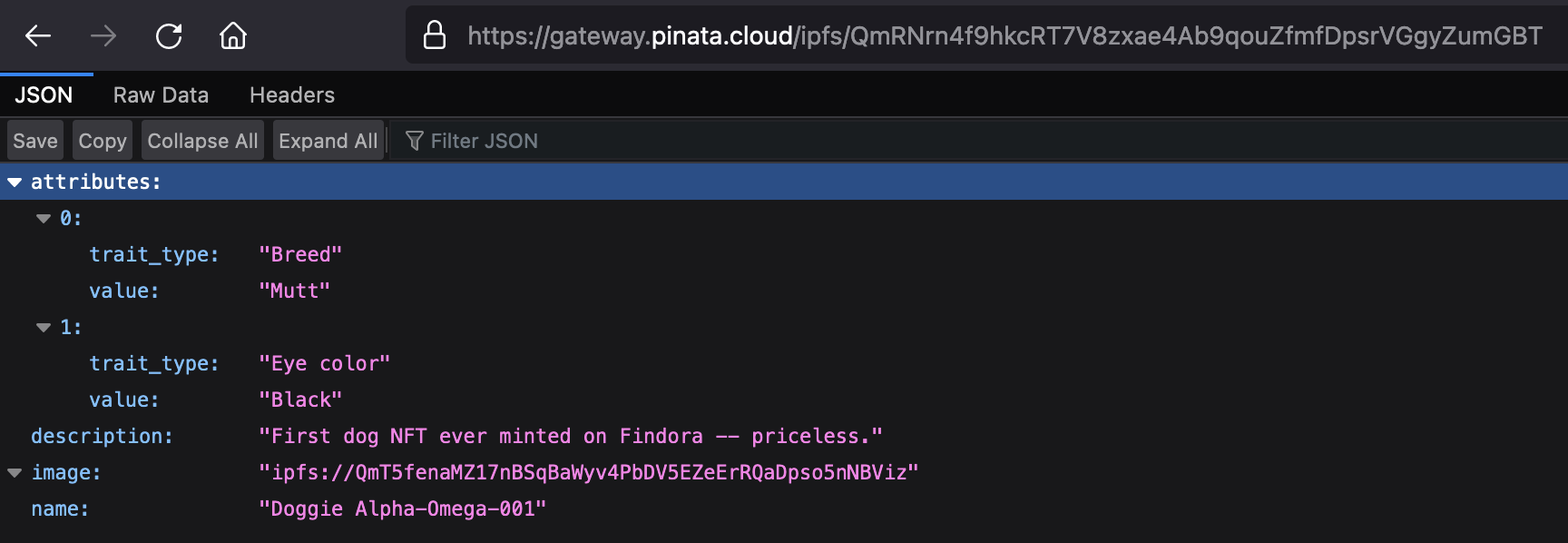 Feel free to change the data in the json. You can remove or add to the attributes section. Most importantly, make sure image field points to the location of your IPFS image — otherwise, your NFT will include a photo of a (very cute!) dog.