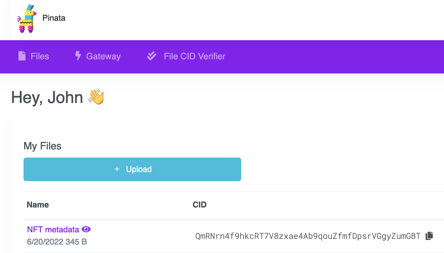 After you upload, you'll see the file info in the table on the "Files" page. You'll also see a CID column. You can copy the CID by clicking the copy button next to it. You can view your upload at: