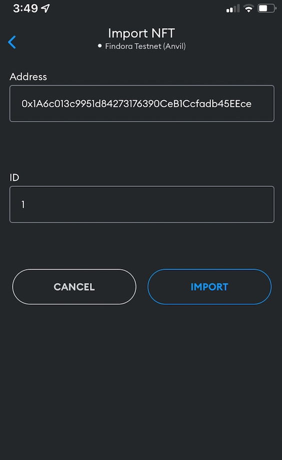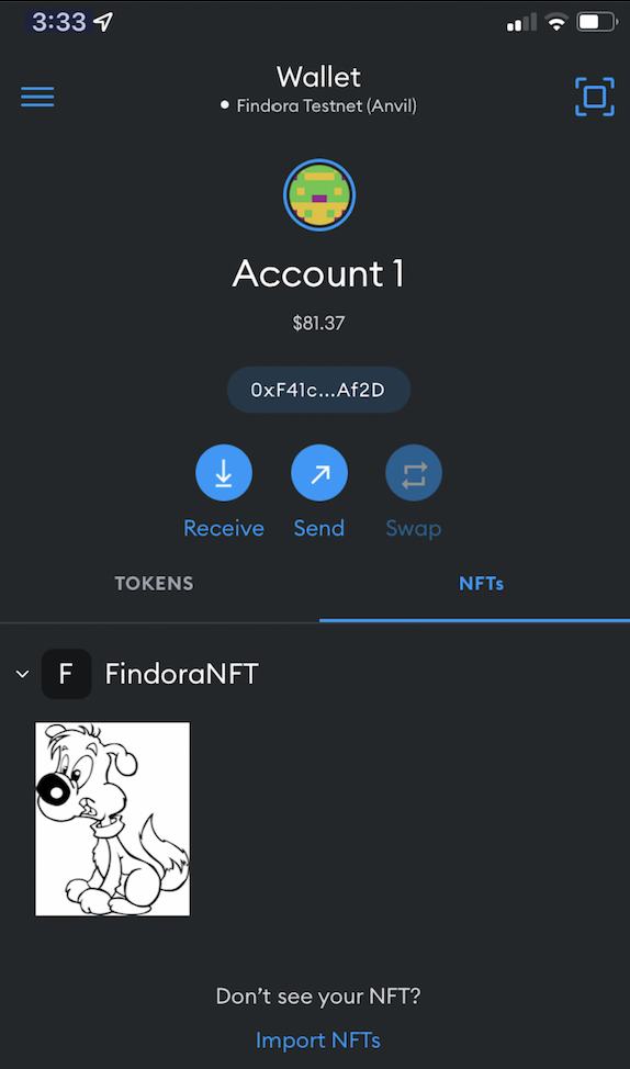 Next, go to your Metamask mobile wallet and check that it's set for Anvil Testnet. Select the NFTs tab next to the TOKENS and click on Import NFTs to add the NFT smart contract address and the ERC-721 token ID of your NFT