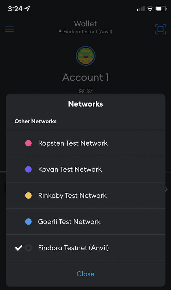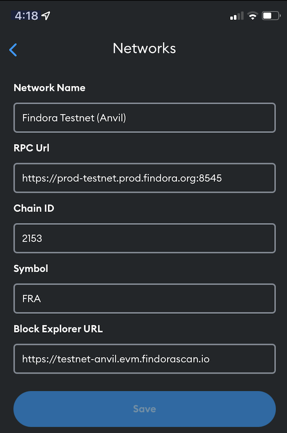 On Metamask mobile goto Settings->Networks->Add network. Then add in the network settings for Findora Anvil Testnet.