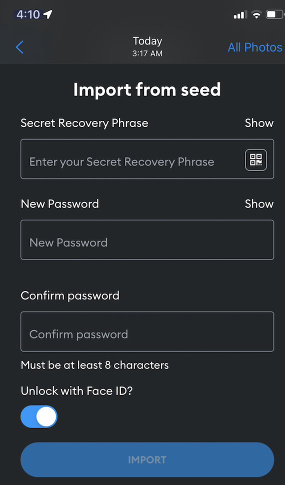 Then, open Metamask on your mobile and select Import from seed and enter in the 12 seed words you copied down earlier. Set your password to finish the import process.
