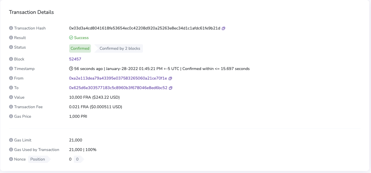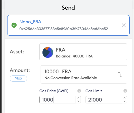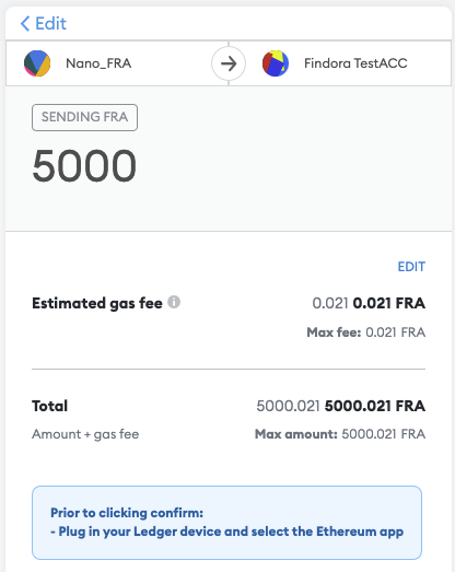Since we are using the Ethereum app, the amounts show up as ETH, but do not worry the actual transfer would be in FRA